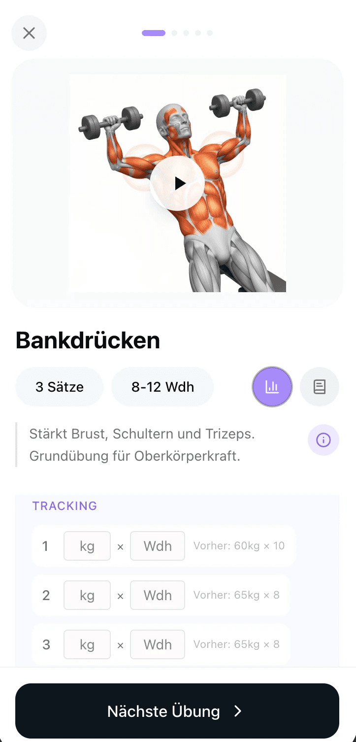 GymBuddy zeigt dir: klare Übungen mit einfacher Erklärung welche Muskeln trainiert werden eine sichere Ausführung Struktur statt Chaos Du weißt jederzeit, was der nächste Schritt ist.